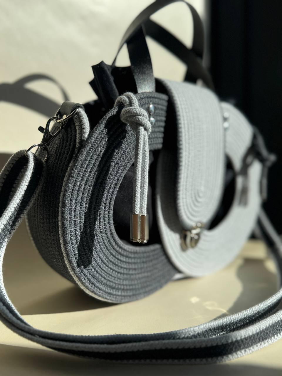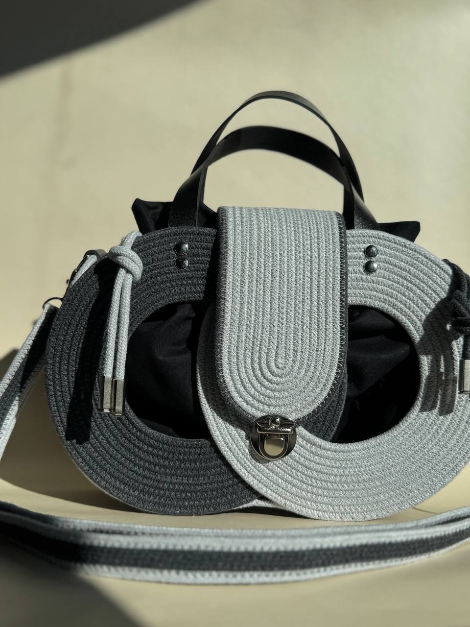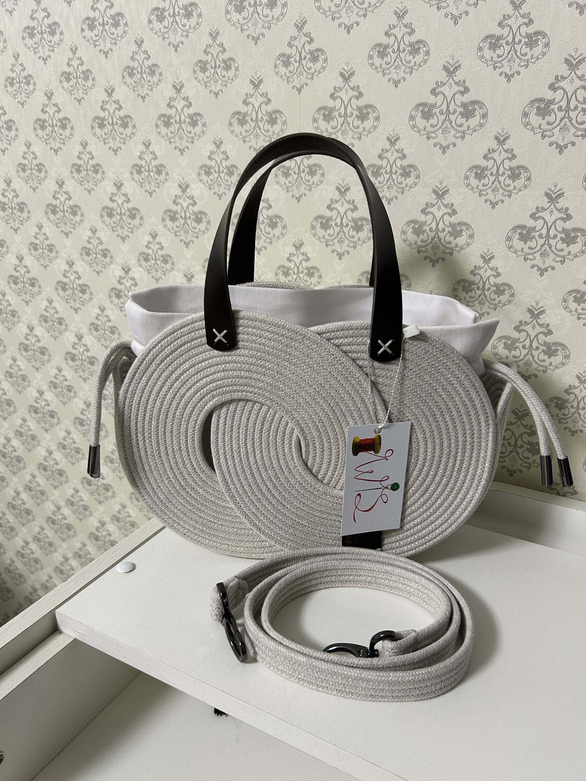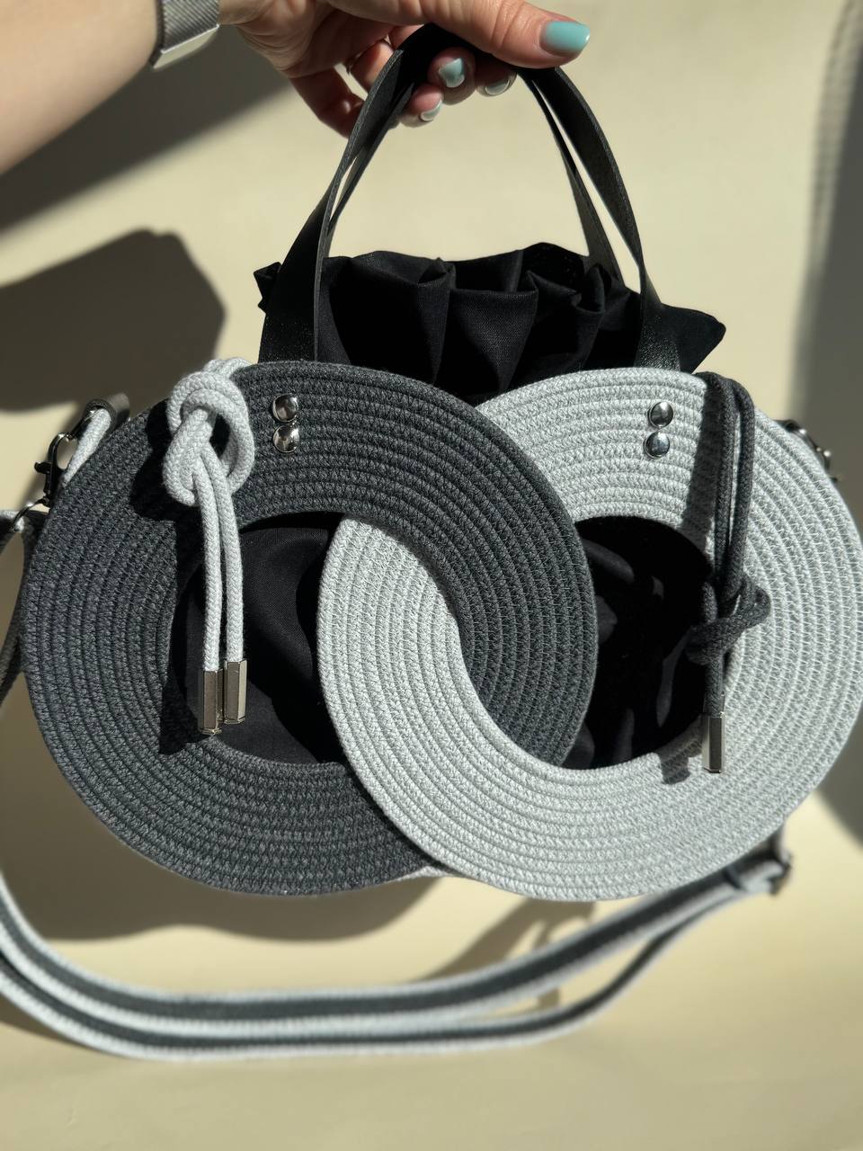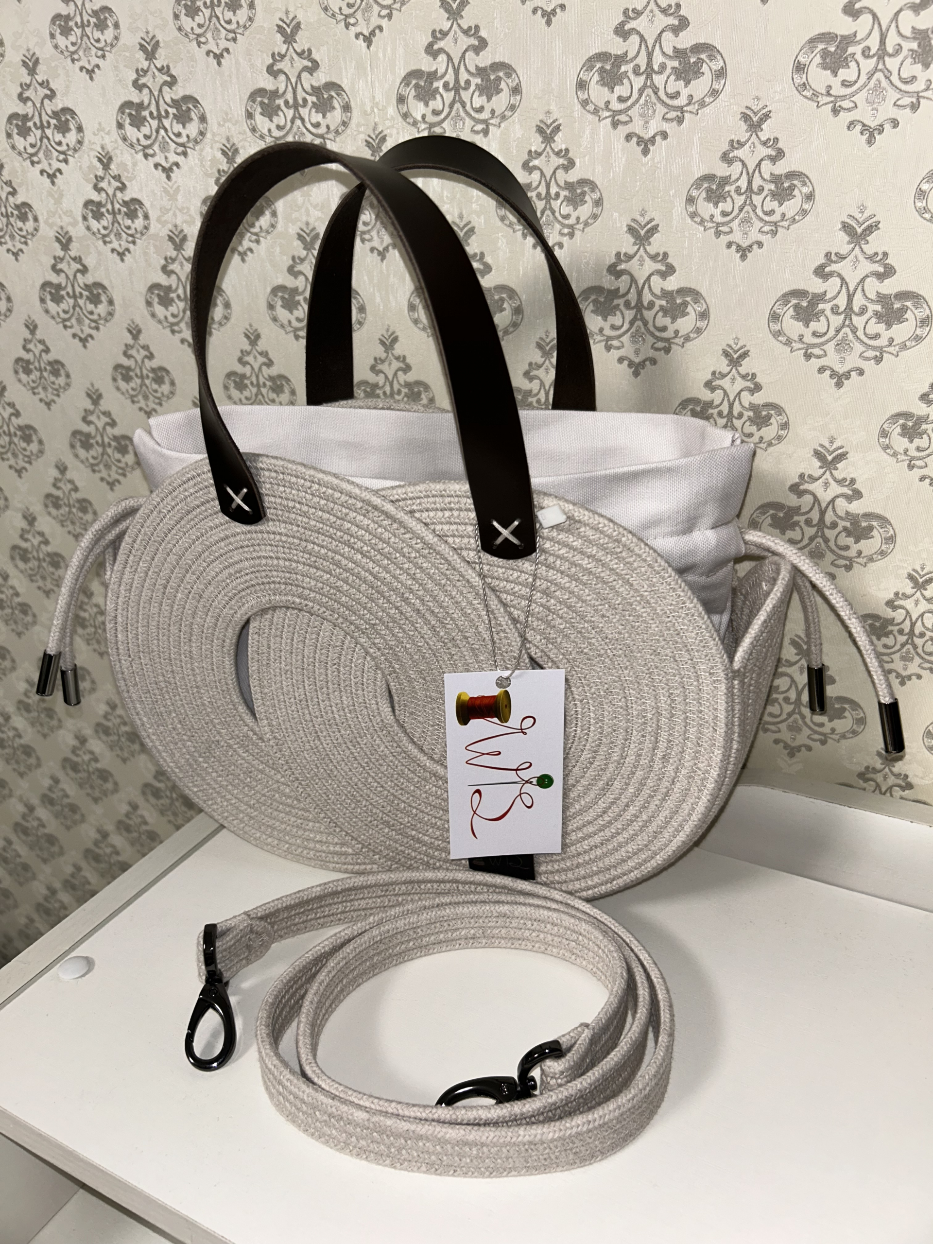 Сумка в комбинации меланж молочный-черный смесь и черный шнур очень стильно смотрится.