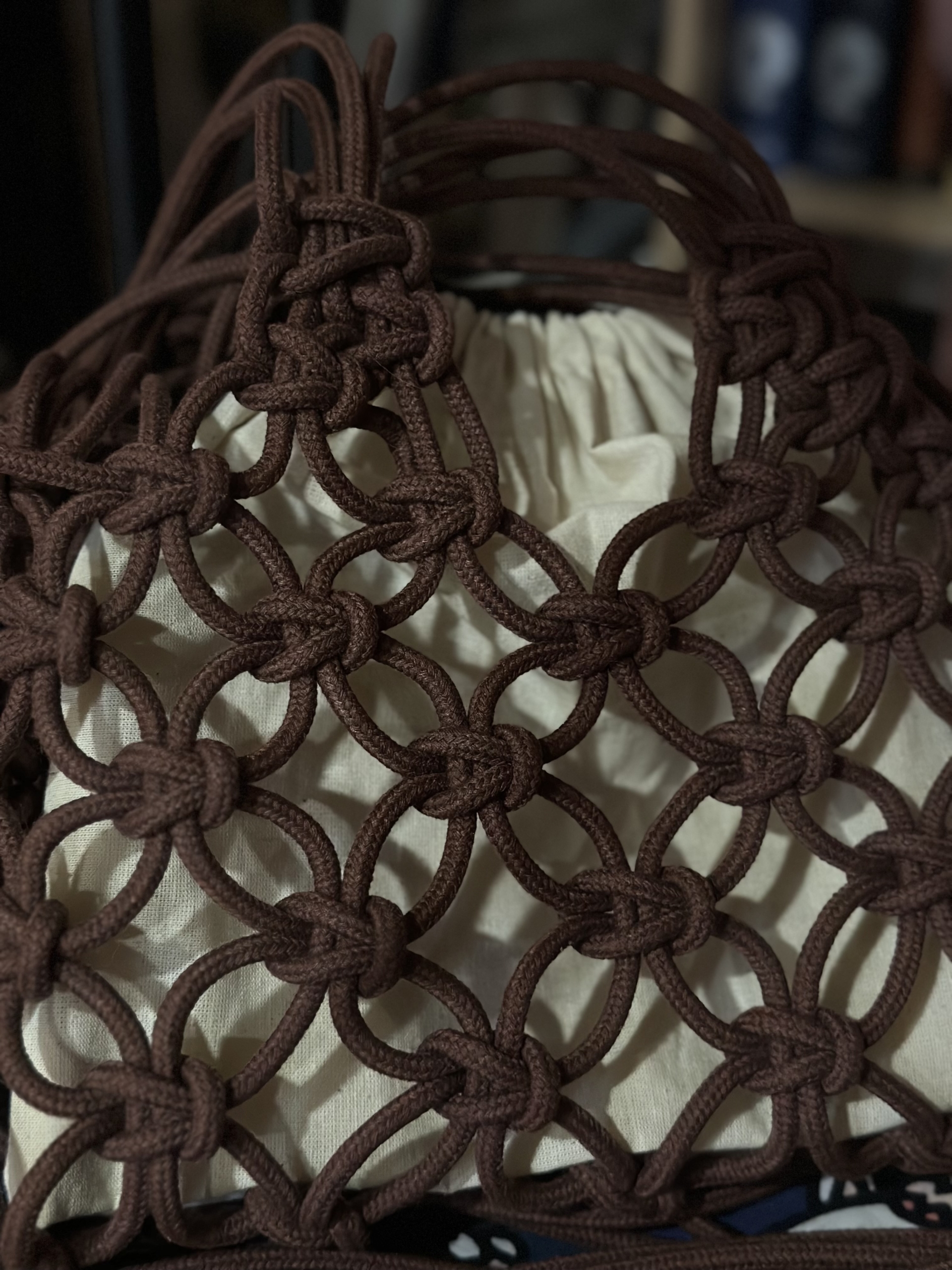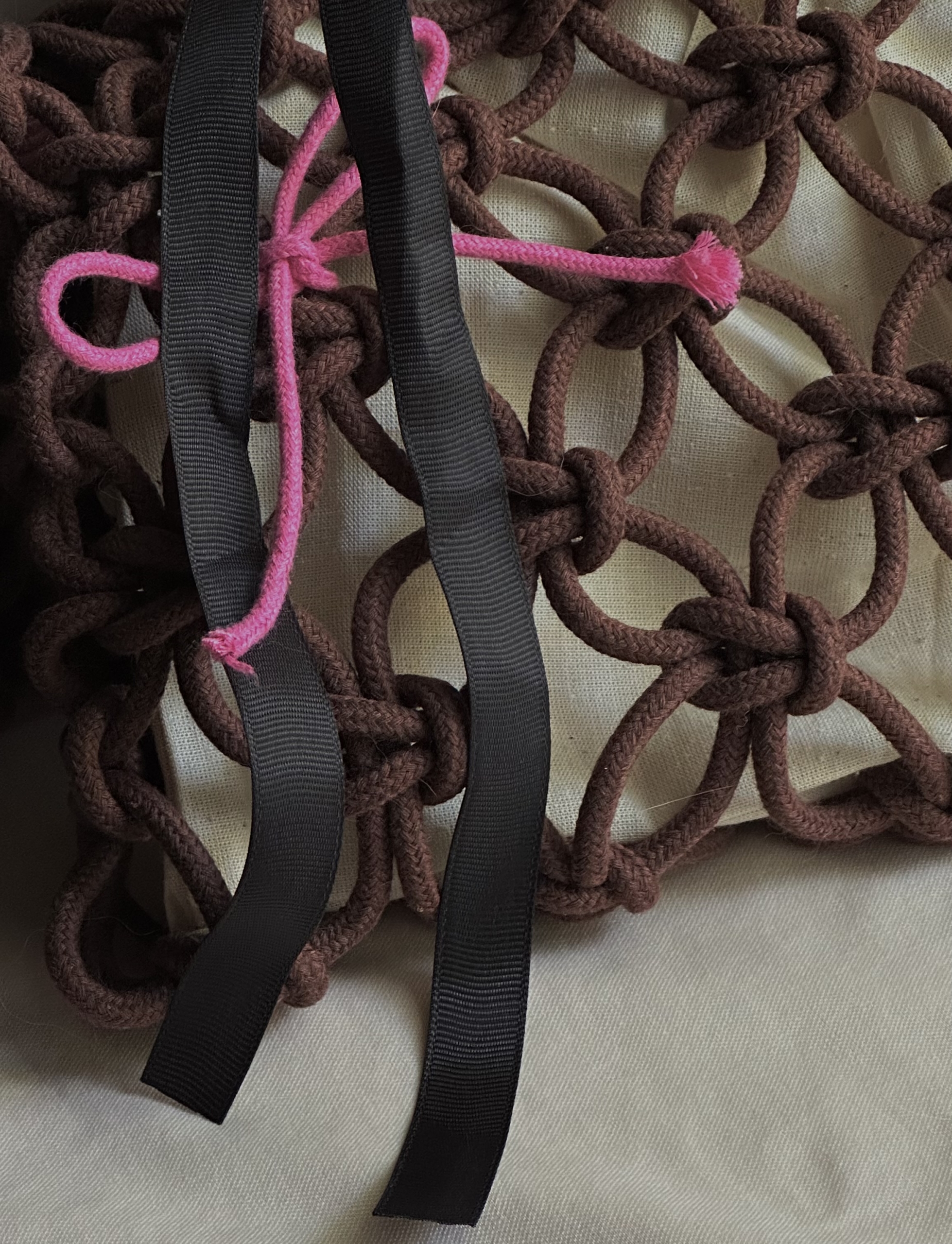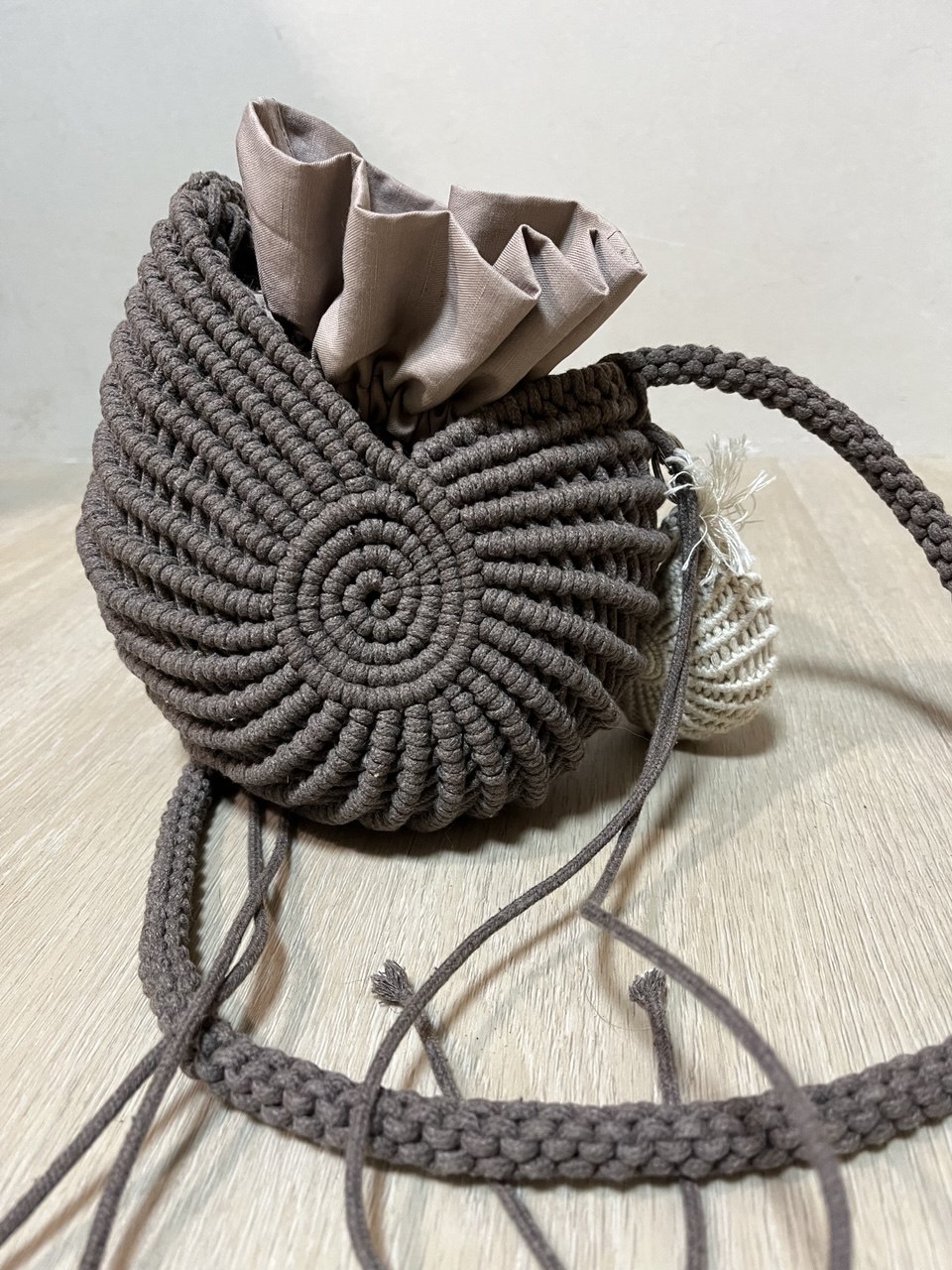 Моя первая сумка, ни разу до этого не брала в руки шнур. Увидев в сети примеры сумок, захотелось попробовать.
