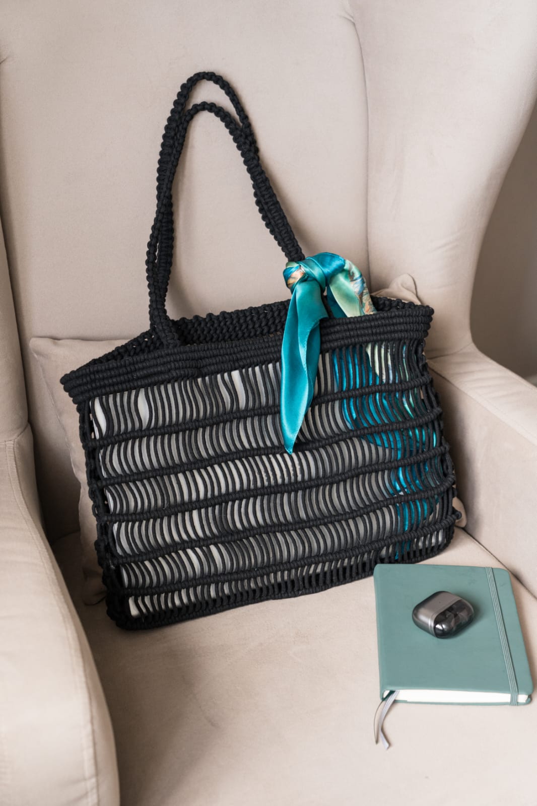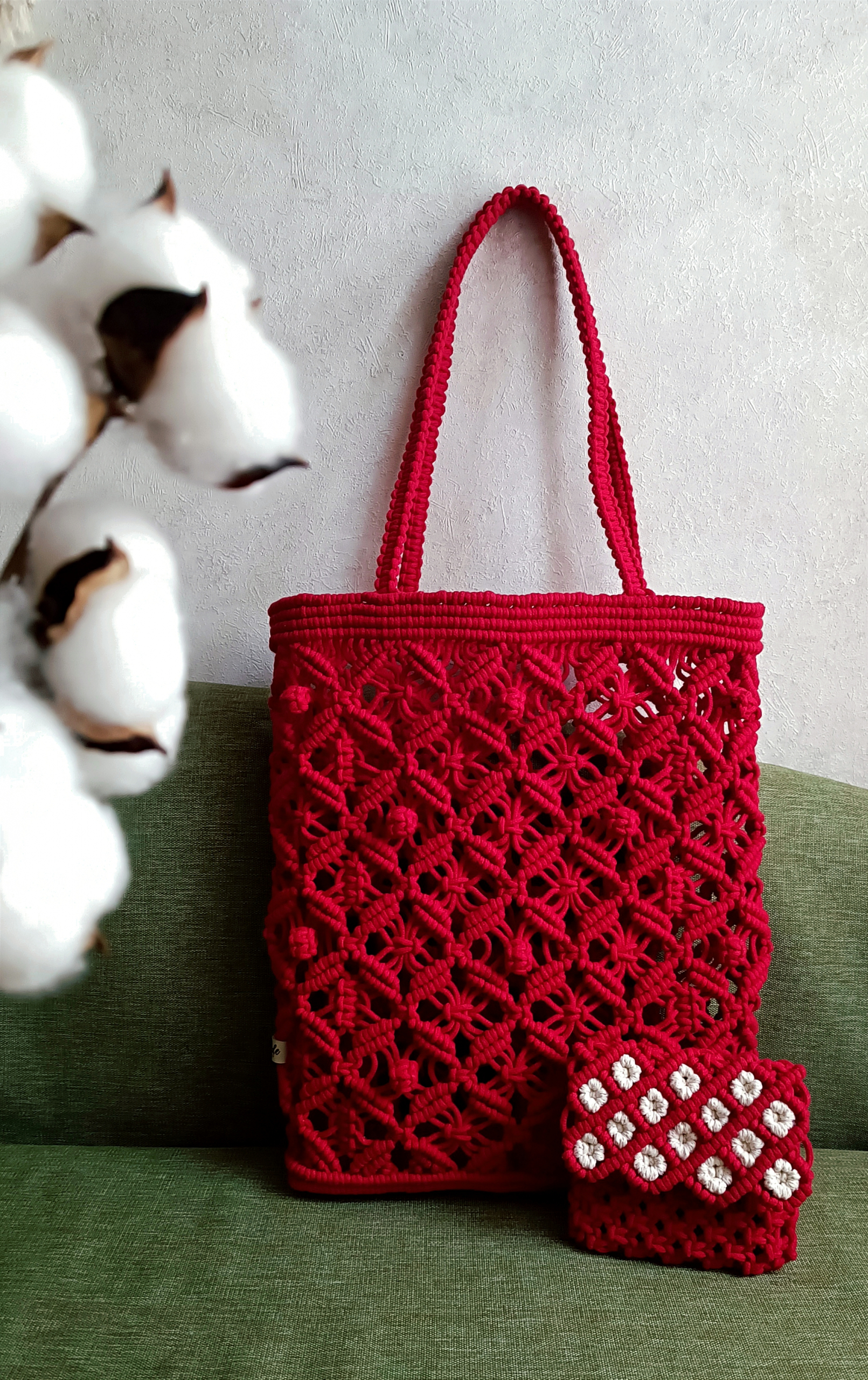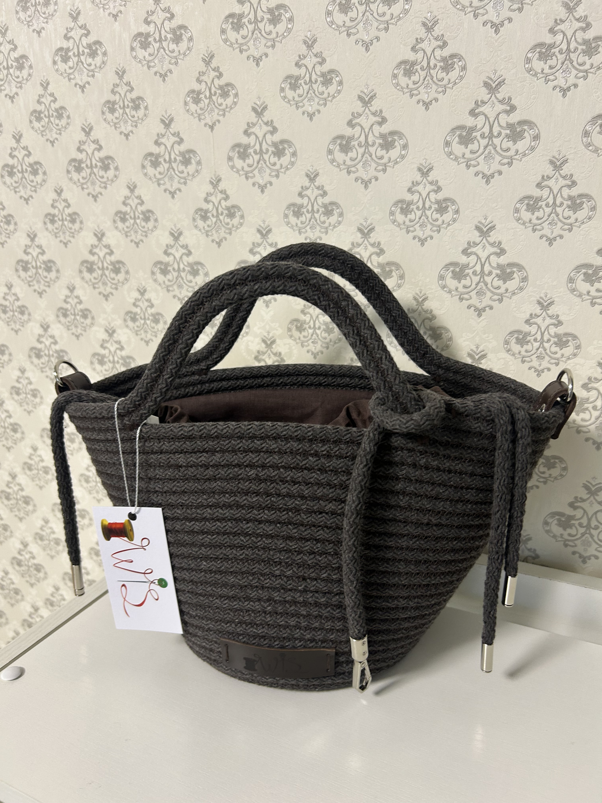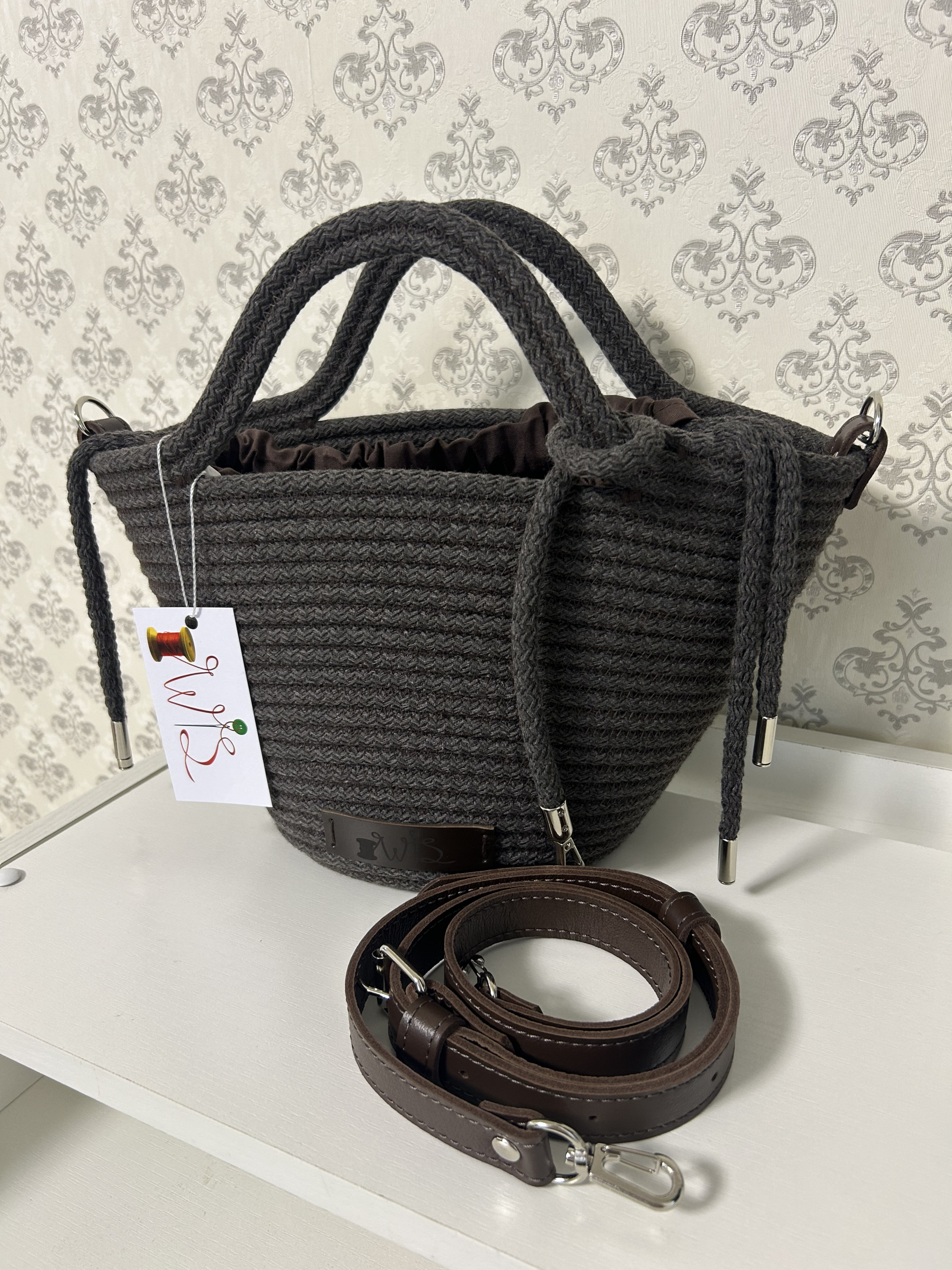 Моя первая сумка, ни разу до этого не брала в руки шнур. Увидев в сети примеры сумок, захотелось попробовать.