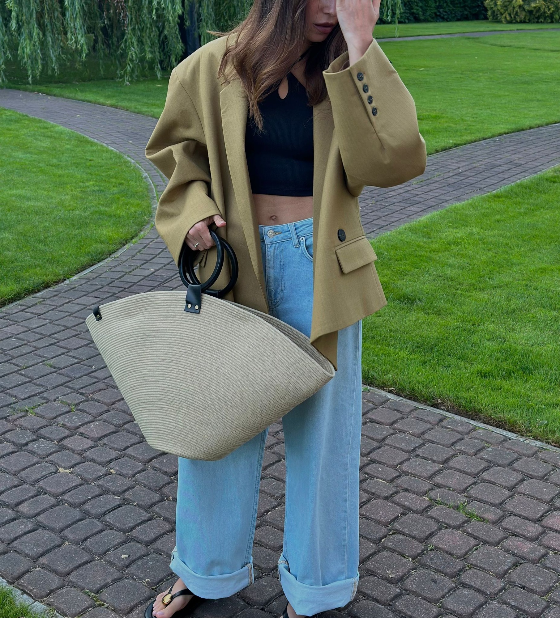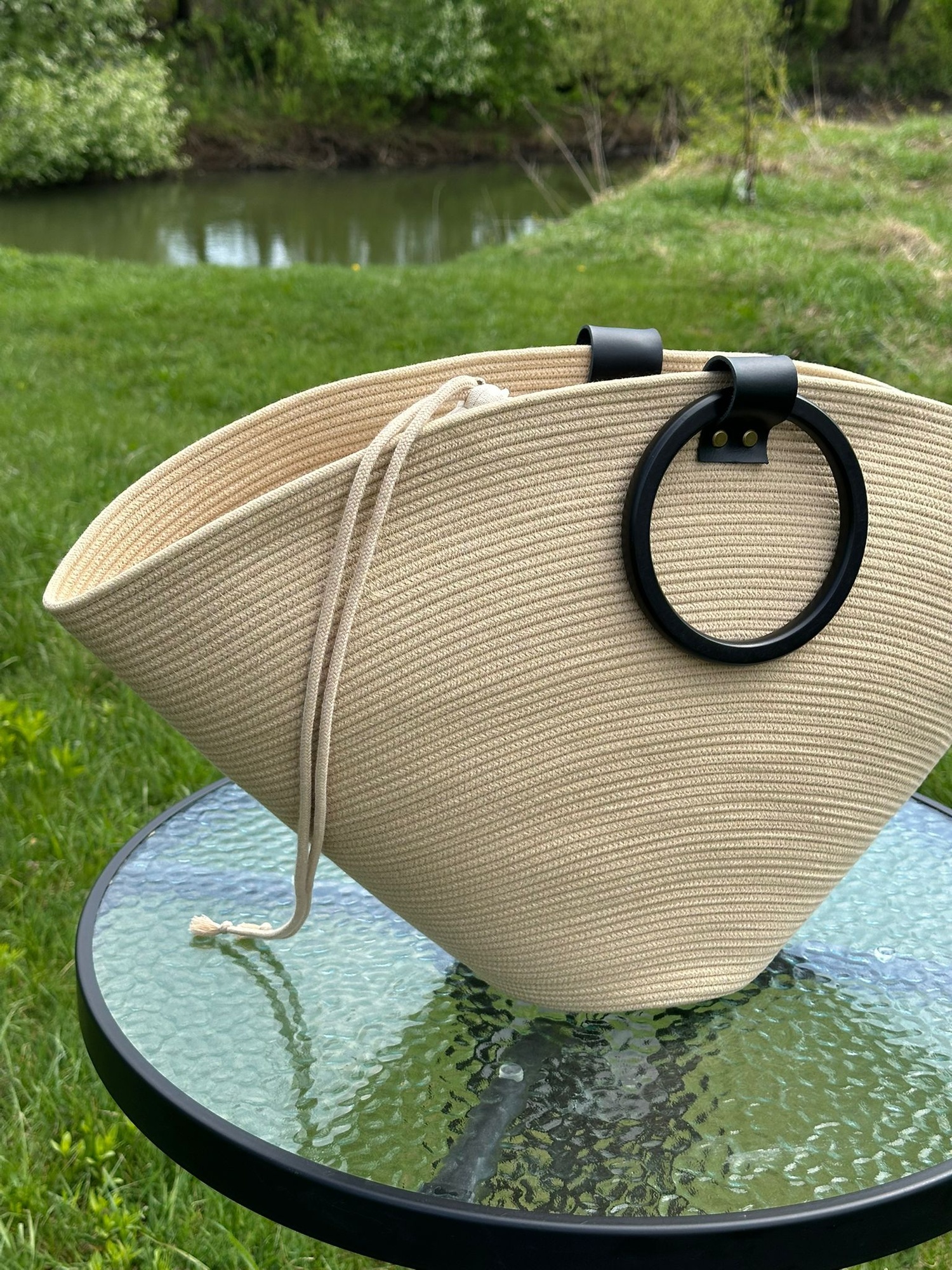 Я случайно купила этот шнур по скидке и просто влюбилась. Из него получаются замечательные пляжные сумки высотой 35 см. Идея создания подсказана Екатериной Зайцевой.