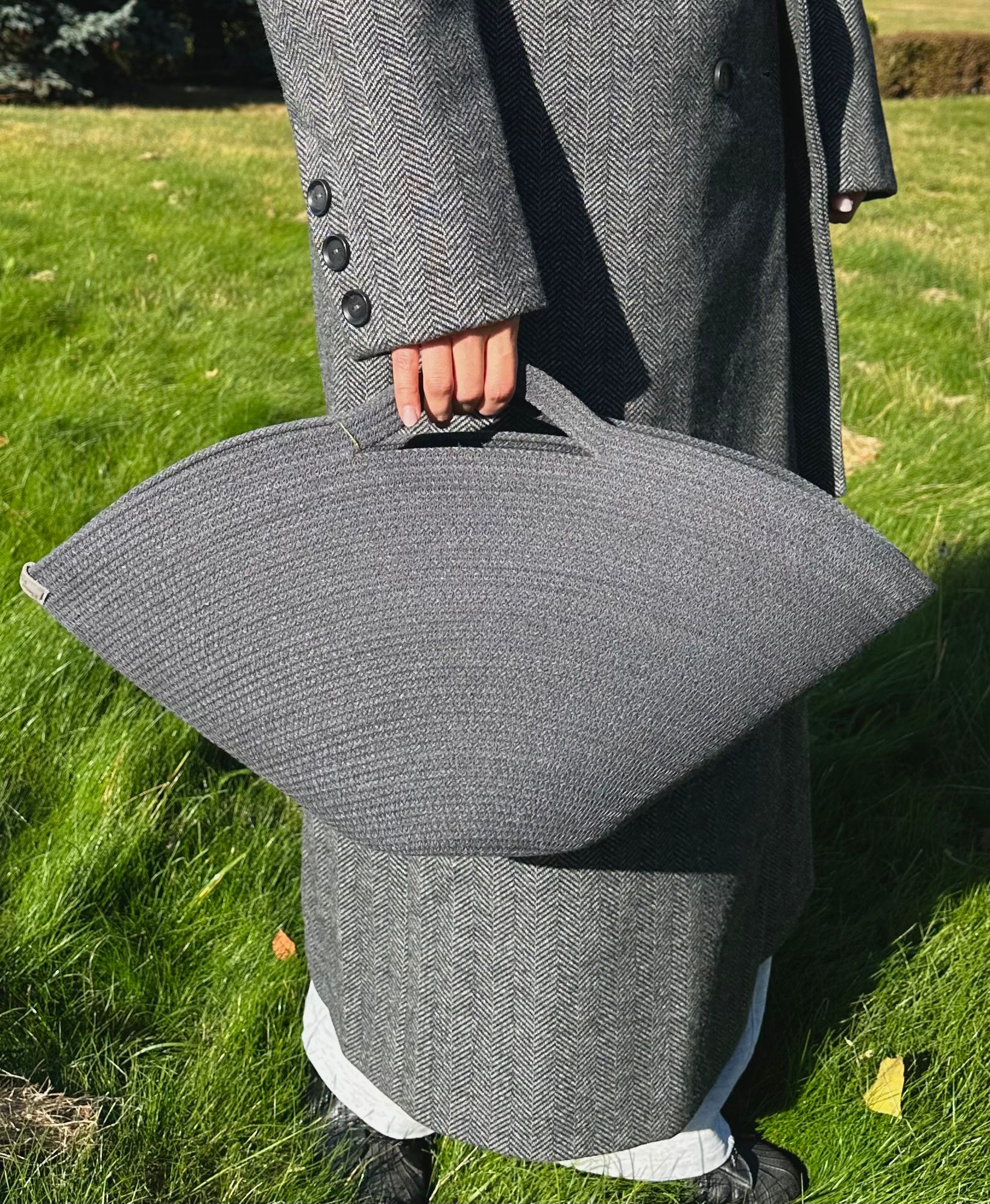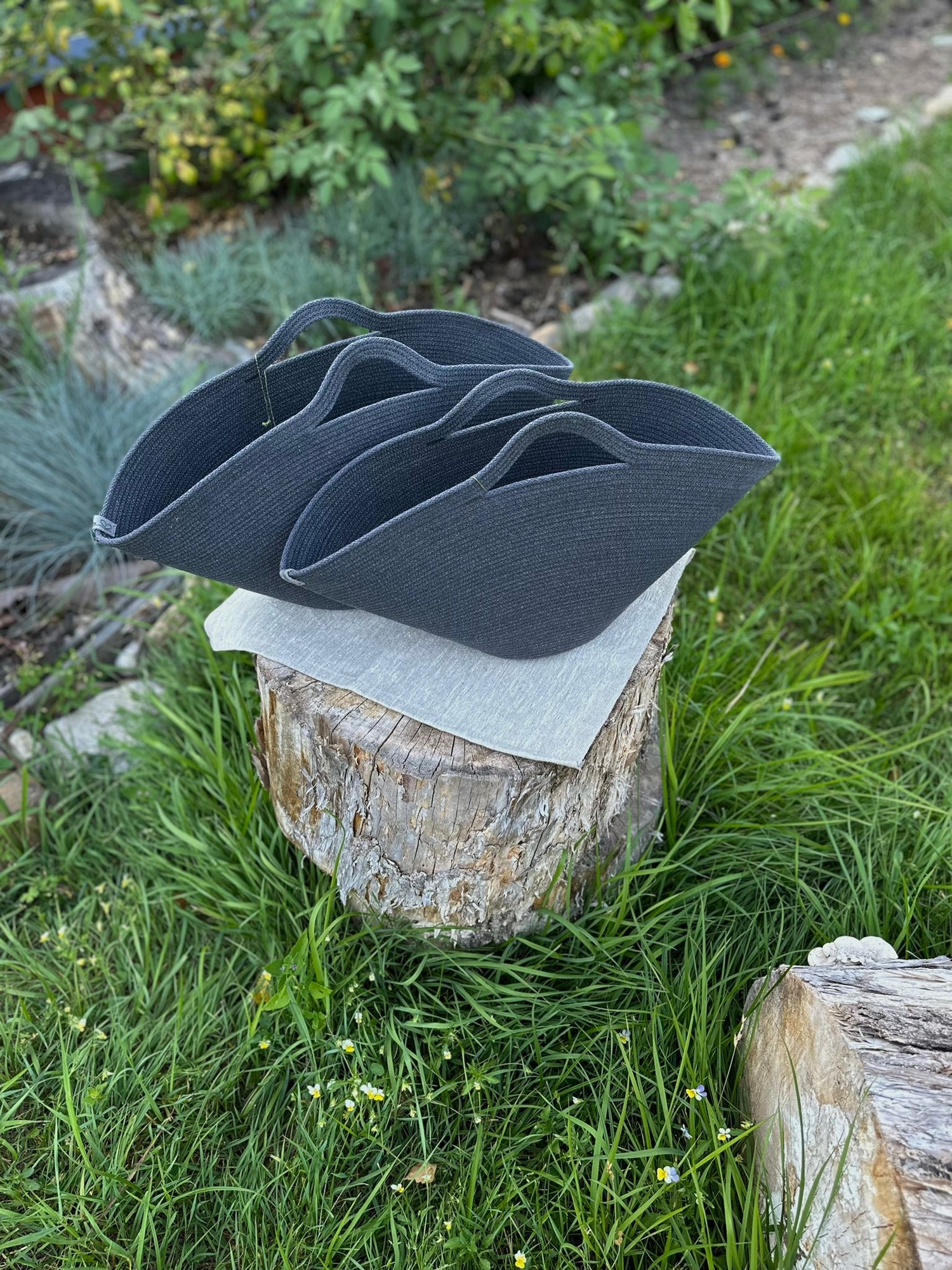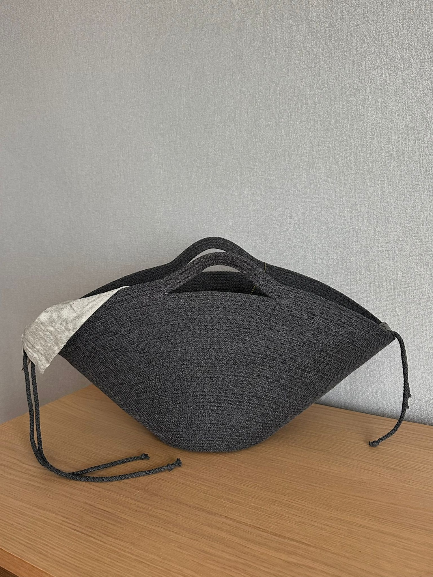 Продолжаю осваивать новые горизонты… Большущая корзина 35*45 см. Шнур вязаный 5 мм графитовый в сочетании со светлым серым. Графит смотрится очень стильно. Шить… просто песня…Спасибо!!!