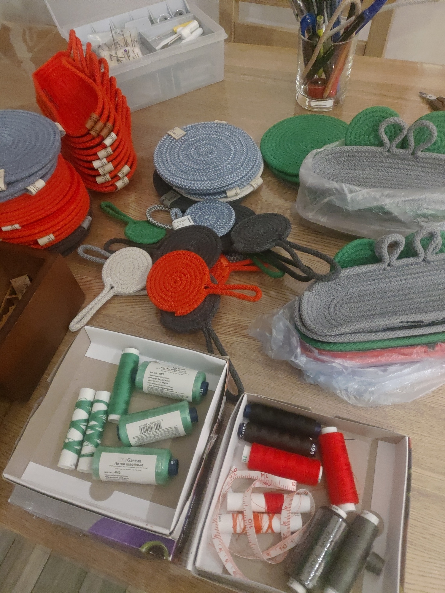 Очень удобно ориентироваться самому в выборе такого многообразия шнуров и взаимодействовать с клиентами. А из мелких остатков шнуров появляется «веселая» палитра обвесов на сумки и корзинки.
