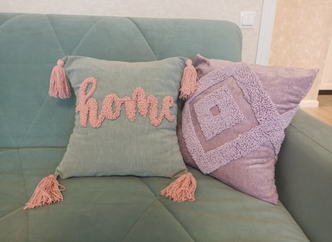 Сделала ещё две наволочки. Розовая + пудровая пряжа, молочная плюс молочная пряжа. Ромбы на молочной наволочке расчертила по линейке. По пять рядов вышивки в одной линии.