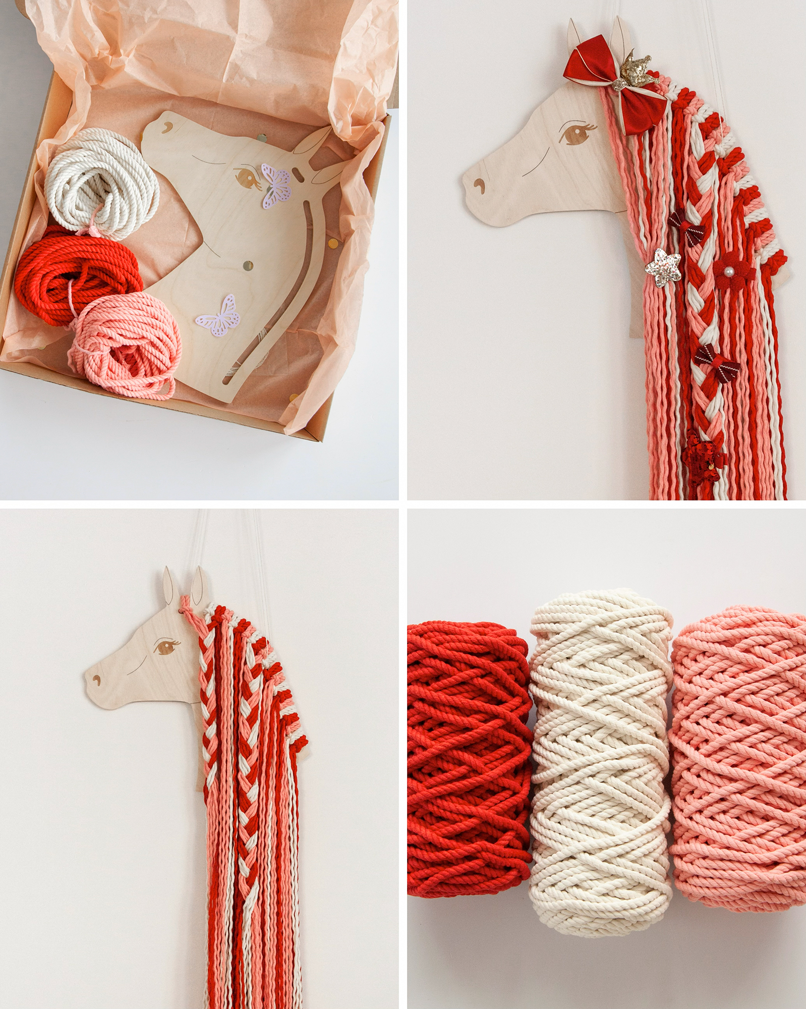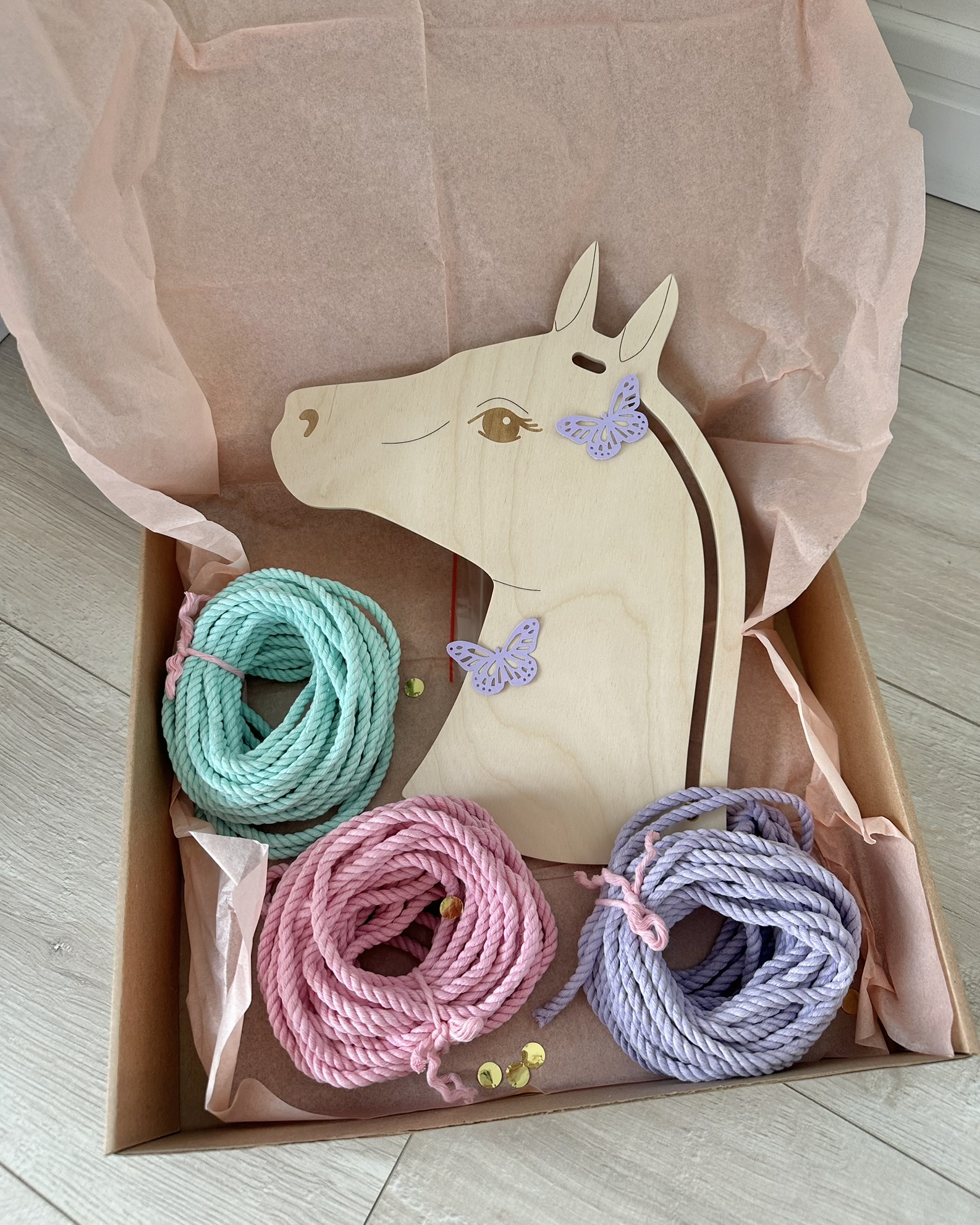 Готовый набор Единорог/Лошадка рассчитан на самостоятельное изготовление красивого Единорога или Лошадки из трёхпрядной верёвки на каркасе.